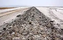 جادهٔ دستساز سنگفرش که با سنگهای تراشخورده روی بستر کویر گرمسار ساخته شده، بطول ۳۵ کیلومتر و عرض ۵ متر در مسیر شاهراه تاریخی اصفهان – ساری در دوره صفوی برای سهولت رفت وآمد کاروانیان که در این مسیر به باتلاقها و نمک زارهای جنوب گرمسار برخورد مینمودند احداث شدهاست تا کاروانها را از گزند سیلابها و زمینهای گلآلود و چسبناک در فصول بارش حفظ کرده، روی این جاده بقایای دو پل سنگی هنوز مشاهده میشود که از تعداد دهنههای پل میتوان حدس زد که هنگام بارندگیبه ویژه در فصول بهار و پاییز چه سیلابی در این دشت وسیع به راه میافتد، این جاده به صورت گرده ماهی و در دوطرف آن کانالهای کوچکی ساخته شده که آبریز جاده میباشد البته لازم به توضیح است که کانالهای مجاور جاده از بین رفتهاست، شالوده جاده از آک و ماسه و بعضاً از خاکستر میباشد، بنا بر شواهد موجود و مطالعات انجام شده عموماً این سنگها به وسیله شتر از کوههای سیاه کوه به محل آورده شدهاست.