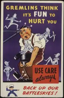 از این موجودات کوچک اندام، نخستین بار افراد نیروی هوایی در جنگ جهانی اول نام بردند. اما در جنگ جهانی دوم بهطور کامل شناخته شدند، گرملینها با دستکاری و خراب کردن دستگاهها و ابزار انسانها، آنها را به ستوه میآورند. مردم معتقدند که چون گرملینها بال ندارند، بنابراین سوار هواپیماها شده و به همین خاطر هواپیماها به صورت ناگهانی خراب شده و سقوط میکنند.