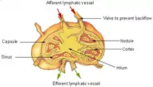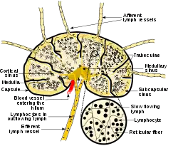 ![]() Diagram of a lymph node, showing the flow of lymph through the گرههای لنفاویes. | |