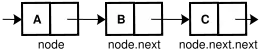 سه نمونه از گره بالا تشکیل یک لیست دوپیوندی با طول ۳ را میدهند: