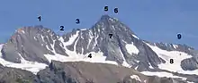 قله این کوه به شکل هرم بوده و از دو بلندی تشکیل شده است: گروسگلوکنر (Groß در زبان آلمانی به معنای بزرگ است) و کلاینگلوکنر با ارتفاع ۳٬۷۷۰ متر (klein در زبان آلمانی به معنای کوچک است).