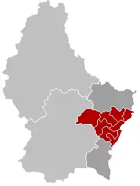 | Communes (فهرست شهرهای لوکزامبورگ in bold) | بتزدورف, بیور، لوکزامبورگ, فلاکسوایلر, گرونماخر, یونگلینستر, مانترناخ, مرترت, وورملدانژ |