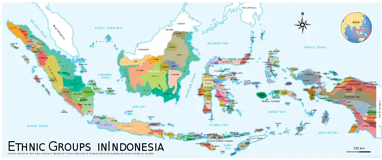 - مشارکتکنندگان ویکیپدیا. «Ethnic groups in Indonesia». در دانشنامهٔ ویکیپدیای انگلیسی، بازبینیشده در ۲۶ دسامبر ۲۰۱۹.