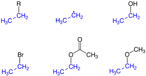 گروه اتیل(به رنگ آبی) متصل به گروههای عاملی مختلف در ترکیبات آلی مختلف