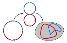 بر اساس تعریف فوق، صرفاً یک مجموعه است. این مجموعه را می توان با استفاده از اتصال حلقه ها تبدیل به یک گروه کرد (به همین دلیل به آن گروه بنیادی می گویند). به طور دقیق تر اگر دو حلقه ی و داده شده باشند، ضربشان را به صورت زیر تعریف می کنیم:
