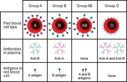 - گروه خونی AB: آنتیژن نوع A و B را در سطح گلبولهای قرمز خود را دارند و در پلاسمای خونشان نیز هیچیک از آنتی کورها را ندارند.