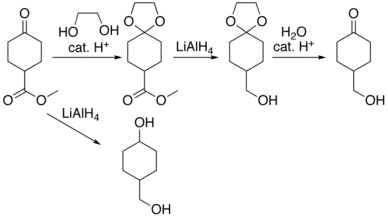 - محافظت از الکلها: استیل، پیوالیک اسید، تتراهیدروپیران، تتراهیدروفوران، تریفنیلمتان، سیلیل اترها (مانند تریمتیلسیلیل (TMS))