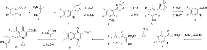 - Hagen, S. E.; Domagala, J. M.; Heifetz, C. L.; Johnson, J. (1991). "Synthesis and biological activity of 5-alkyl-1,7,8-trisubstituted-6-fluoroquinoline-3-carboxylic acids". Journal of Medicinal Chemistry. 34 (3): 1155–61. doi:10.1021/jm00107a040. PMID 2002456.