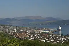 ![]() View northwest over Greenock and the River Clyde, with the کارائیب پرینسس at Greenock Ocean Terminal | |