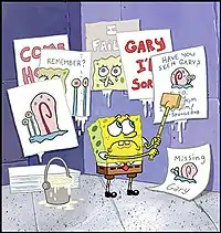 ![]() باب اسفنجی در حال چسباندن پوستر برای برگردانندن گری | |
