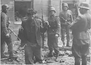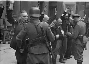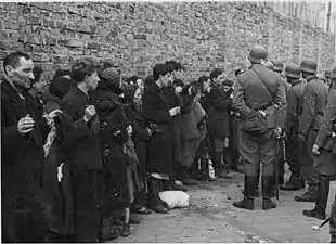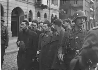 یهودیان دستگیر شده توسط سربازان وافن اساس به سوی اومشلاگپلاتز برده میشوند. در پشت، ۶۲ & ۶۳ خیابان Nowolipie.