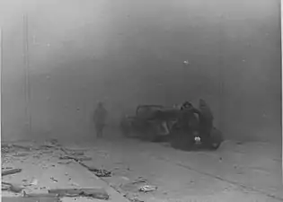 نفر دوم از چپ اشتروپ؛ پشت سرش یا دستیار اشتروپ کارل کالسکه، یا اریخ اشتایدمان; سمت راست تصویر یوززف بلوش. شماره ۶۴ خیابان Nowolipie نزدیک Smocza.
