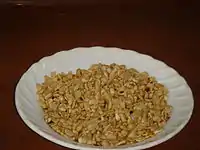 - روغن: بذرهای جمعآوری شده پس از جداسازی پوست از مغز بهطور کلی له میشوند و پس از له شدن در داخل دیگی ریخته و آب به آن اضافه میشود و در معرض حرارت آتش قرار گرفته و محلول به دست آمده بدون وقفه هم زده میشود. روغن موجود در بذرها در اثر حرارت در سطح آب قرار میگیرد و به وسیله قاشق جمعآوری میشود. عملکرد تولید روغن به روش سنتی بیش از ۲۰ درصد برآورد شدهاست و در صورت استفاده از روشهای مناسب و مکانیزه روغنگیری این عملکرد تا ۴۰ درصد قابل افزایش است. روغن به دست آمده مایع و درجه انجماد آن بسیار پایین و به ندرت فاسد میشود. علاوه برارزش خوشخوراکی و استفاده در طبخ غذا در صنعت نیز برای جلاکاری، عطرسازی، روغنکاری چرخ دندههای ساعتهای دیواری، مچی و چرخهای خیاطی و ماشینهای مکانیکی ظریف و چرخنده دار کاربرد دارد.