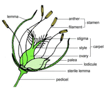- پرچمها: مجموعاً اندروسیوم نامیده میشوند. هر پرچم از یک بساک یا قسمت حامل گرده و یک میله یا پایه تشکیل میگردد. غالباً گردههای آزادشده به وسیلهٔ بساک با بزرگ نمایی به صورت کُرههای زرد بسیار کوچک به نظر میرسند. گرده معمولاً توسط حشرات یا باد به کلاله حمل میگردد. پرچمها اندامهای نر گل هستند.