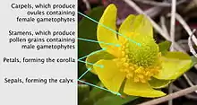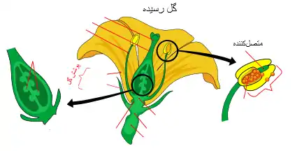 - مادگی: حلقه درونی گل، متشکل از یک یا چند بخش به نام برچه. برچه یا چند برچه چسبیده به هم به شکل یک ساختار توخالی هستند که تخمدان نامیده میشود که تخمک را درون خود تولید میکنند. تخمکها مگااسپورانژیا هستند و با روش میوز مگااسپور تولید میکنند که گامتوفیت ماده است و منجر به سلولهای تخم میشود. مادگی یک گل با اصطلاحات جایگزین در جایی که ساختارش را در حلقه درونی گل میبینید توصیف میشود (متشکل از یک تخمدان، خامه و کلاله). مادگی از یک یا چند برچه که به هم متصل هستند تشکیل شدهاست. بخش چسبناک بالای مادگی، کلاله، گیرنده گرده میباشد. از یک تخمدان قاعدهای، یک خامهٔ میانی، و یک کلاله انتهایی تشکیل میشود. تخمدان محتوی تخمکهاست که توسط پوشش احاطه شدهاست و بعد از لقاح به صورت بذر رشد مییابد. کلاله یک جمعآوریکنندهٔ گرده است و خامه در زیر آن گذرگاهی است که گرده را به سمت تخمک هدایت میکند. مادگی اندامی ماده است. ارتباط بین مادگی و حفره گل هیپوجینوس (در زیر تخمدان بالایی)، پریجینوس (اطراف تخمدان بالایی) یا اپی جینوس (بالاتر از تخمدان تحتانی) توصیف میشود.[2]