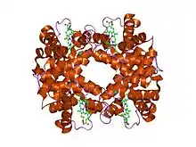![]() the Structure of deoxyhemoglobin Rothschild 37 beta Trp----Arg: a mutation that creates an intersubunit chloride-binding site.[1] | |||||||||