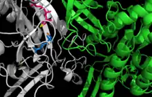 ![]() Active site between two monomers of glutamine synthetase from Salmonella typhimurium. Cation binding sites are yellow and orange; ADP is pink; phosphinothricin is blue.[1] | |||||||||