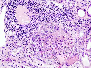 | Histopathological image of crescentic glomerulonephritis in a patient with MPO-ANCA positive rapid progressive glomerulonephritis. Hematoxylin & eosin stain. | |