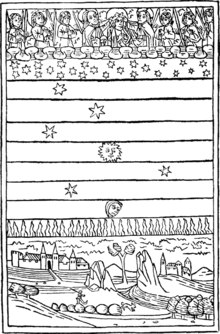 حکاکی فلاماریون (۱۸۸۸) یک مسافر را مجسم میکند که به لبهٔ زمین صاف رسیدهاست و سر خود را به گنبد آسمان چسبانده است. مفهوم آسمان به عنوان جسم جامد (بر یک گسترهٔ اتمسفر مانند ترجیح داده شده) میان تمدنهای باستانی و فرهنگهای اخیر، به همراه یونان باستان , مصر , چین , هند , بومیان استرالیا و همچنین مسیحیان اولیه گسترده شده بود. آسمان در اساطیر و اشعار بین النهرینی و هند و اروپایی به صورت گنبدی جامد که بر فراز زمین کمان زده ترسیم شدهاست. خدای آسمان سومریان آن , این گنبد آسمان مانندها را "بهشتها " نامگذاری کرد که خدای باد صفحهٔ صاف زمین زیر را از دریاهای اصلی بالای گنبد آسمان جدا کردهاست. هندیان باستان همچنین به آسمان صلب اعتقاد داشتهاند. ریگ ودا گفته است: "آسمان و زمین سخت و محکم هستند." این دستیابی به کیهانشناسی احتمالاً جهانی است و همچنین با اسطورههای جهان جدید روبرو میشود.