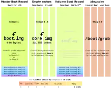 boot.img has the exact size of 446 Bytes and is written to the MBR (sector 0). core.img is written to the empty sectors between the MBR and the first partition, if available (for legacy reasons the first partition starts at sector 63 instead of sector 1, but this is not mandatory). The /boot/grub-directory can be located on an distinct partition, or on the /-partition.گراب به صورت پویا قابل تنظیم است. در زمان راه اندازی تنظیمات پیکربندی خود را بارگذاری میکند و اجازه تغییر در زمان راه اندازی مانند انتخاب هستههای متفاوت یا تنظیم اولیه حافظه دیسک را میدهد. به این منظور، گراب یک واسط خط فرمان ساده و شبه بش را فراهم کردهاست که به کاربر اجازه میدهد علاوه بر لیست منوهای پیشفرض در همان زمان توالی بوت جدید بنویسد.
