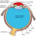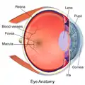 ![]() Schematic diagram of the چشم انسان، with the fovea at the bottom. It shows a horizontal section through the right eye. | |