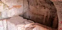 در میان دو سکو، مدخل مستطیل شکلی وجود دارد که به اتاق زیرین پیوند داده میشود. درون این اتاق، گوری در داخل سنگ کنده شدهاست. در کنار این قبر نیز سکویی دیده میشود. در دیوار شمالی این اتاق، دو طاقچه کوچک برای قرار دادن نذورات و هدایا کنده شدهاست. با توجه به شکل پایه ستون، نوع تراش و سقف اتاق زیرین به نظر میرسد که این گوردخمه نیز متعلق به دوره [فراهخامنشی] باشد.