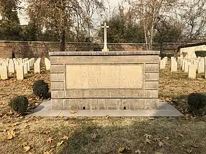 ورودی گورستان بنای یادبودی به چشم میخورد که تلفیقی از معماری ایران در ادوار مختلف را به دوش میکشد. گنبد فیروزهای شکل آن نمادی از گنبدهای اماکن اسلامی در ایران است و ۴ گوشه آن شکل و شمایل اماکن مذهبی زرتشتیان را به خود گرفته.۷ کتیبه بزرگ درست پشت بنای یادبود به چشم میخورد که روی آن اسامی افراد مهاجر یا مستشارانی هست که در حوزه جغرافیایی ایرانشهر یعنی ایران و کشورهای اطراف آن جان خود را از دست دادهاند و هرگز نشانی از آنها پیدا نشده است. اغلب این افراد جان خود را در جنگهای جهانی از دست دادهاند و پیکرشان هیچوقت شناسایی نشده است.[1]