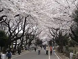![]() ساکورا در گورستان یاناکا و ایستگاه پلیس در سمت چپ. | |