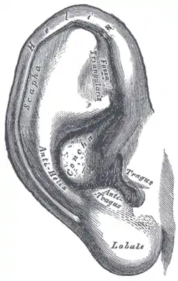 گوش بیرونی بخش خارجی از سامانه شنوایی است که متشکل از برگچه گوش یا لاله گوش و دهانه خارجی دالان شنوایی است. وظیفه آن جمعآوری٬ پالایش فیزیکی و تمرکز انرژی صوتی و فرستادن آن بر روی پرده گوش یا پرده صماخ است..[1]