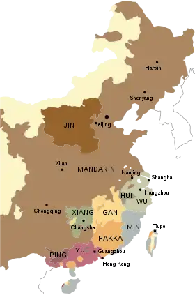 ![]() پراکندگی گویشهای مختلف زبان چینی در چین براساس اطلس زبانی چین | |