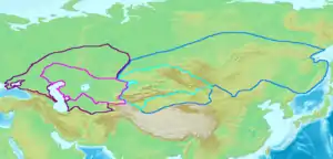 ![]() گستره خاقانات ترک در زمانهای ابتدایی حکومتشان | |