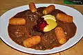 گویاش گوشت گوزن و آهو با سیب و توت و کوفته سیب زمینی.