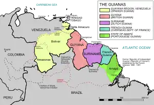 نقشه سیاسی گویانها که منطقه گویان در ونزوئلا (گویان اسپانیای پیشین) و گویان برزیل (گویان پرتغال پیشین) را در بر میگیرد.