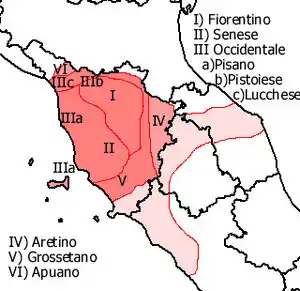 | منطقه | توسکانی (بجز استان ماسا-کارارا) اومبریا (مرز غربی با توسکانی) جزیره کرس, کرس شمالی (به عنوان یک زبانگونه) ساردنیا, گالورا (به عنوان یک زبانگونه) |