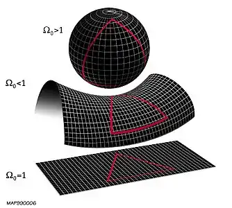 که در آن (r, θ, φ) متناظر با یک سیستم مختصات کروی است. این متریک تنها دو پارامتر نامعین دارد. یک فاکتور مقیاس طول بدون بعد R مقیاس اندازه جهان را به صورت تابعی از زمان توصیف میکند؛ افزایش مقدار R به معنی انبساط جهان است.[112] یک شاخص خمش k هندسه جهان را توصیف میکند. شاخص k به شکلی تعریف شده که مقدار آن تنها میتواند صفر، متناظر با هندسه اقلیدسی تخت؛ ۱، متناظر با فضایی انحنای مثبت؛ و ۱-، متناظر با فضایی با خمیدگی مثبت یا منفی باشد.[113] مقدار R به عنوان تابعی از زمان به k و ثابت کیهانی بستگی Λ دارد.[114] ثابت کیهانی نماینده چگالی انرژی خلاء فضاست و ممکن است با انرژی تاریک مرتبط باشد.[75] معادلهای که تغییرات R در زمان را توصیف میکند معادلات فریدمان نام دارد که از روی نام مبتکر آن الکساندر فریدمان گرفته شدهاست.[115]