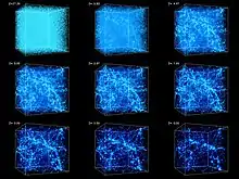 جهان و محتویات آن در گذر زمان تکامل یافتهاند؛ مثلاً جمعیت نسبی اختروشها و کهکشانها تغییر کرده[59] و خود فضا نیز منبسط شدهاست. این انبساط میتواند پاسخی برای این پرسش باشد که چرا دانشمندان روی زمین میتوانند نور کهکشانی را که ۳۰ میلیارد سال نوری با آنها فاصله دارد، ببینند؛ در حالیکه نور حداکثر در حدود ۱۳ میلیارد سال (بهاندازهٔ سن جهان) برای انتشار و رسیدن به آنها زمان داشتهاست. پاسخ این پرسش این است که خود فضای بین زمین و کهکشان مزبور منبسط شده و آنها را از هم دور کردهاست. انبساط فضا همچنین با این مشاهدهٔ تجربی همخوانی دارد که نور دریافتی از کهکشانهای دور دچار پدیدهٔ انتقال به سرخ میگردد؛ از آنجا که جهان در انبساط است و این کهکشانها در حال دور شدن از ما هستند، طول موج فوتونهای منتشر شده از این منبع نور متحرک در طول سفر خود کشیده شده و افزایش مییابد و بسامد کاهش مییابد. بر پایه مطالعات انجام شده بر روی ابرنواختر نوع Ia و دادههای دیگر، سرعت انبساط در حال افزایش است.[60][61]