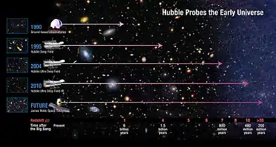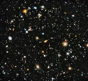 ![]() تصویر میدانِ فوق عمیقِ هابل، برخی از دورترین کهکشانهایی را نمایش میدهد که با فناوریهای امروزی قابل دیدن هستند. هر یک از میلیاردها ستاره تشکیل شدهاند. این تصویر بخش بسیار کوچکی از آسمان (اندازهٔ ظاهری آن ۱٫۷۹ برابر ماه کامل) را نشان میدهد.[1] | |