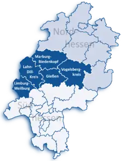 ![]() نقشهٔ ایالت هسن؛ قسمت روشنشده، منطقهٔ دولتی گیسن (منطقه) را نشان میدهد. | |