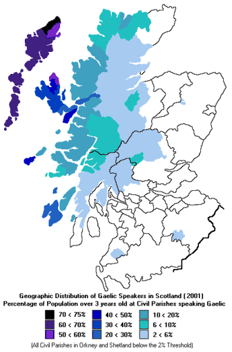پراکندگی گویشوران گیلیک در سال ۲۰۰۱.