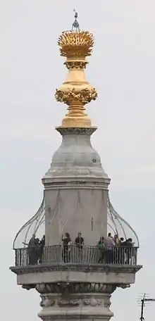 بنای یادبود شامل یک ستون دوریک ساخته شده از سنگ پورتلند است که در فراز آن یک مشعل آتش طلاکاری شده قرار دارد. این بنا توسط کریستوفر رن و رابرت هوک طراحی شدهاست و ارتفاع آن فاصلهٔ بنا را از محل فروشگاه توماس فارینر (یا فارینور)، نانوای پادشاه، که محل شروع آتشسوزی است نشان میدهد.