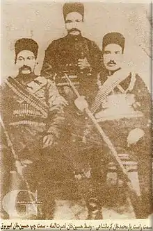 ![]() یارمحمد خان (سمت راست)، حسین خان نصرت المله (وسط)، حسین خان امیربرق (سمت چپ) | |
