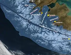 نقشه گسترش یخسار پاتاگونیا در محدوده تنگه ماژلان طی آخرین عصر یخبندان. سکونتگاههای جدید با نقاط زرد رنگ مشخص شدهاند. سطح دریا در آن زمان بسیار پایینتر از سطح دریا در این تصویر بوده است.