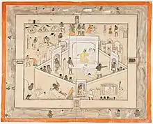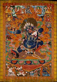 Four-armed and dark-complexioned Yama rides on his bejewelled and caparisoned buffalo. In his upper right hand is the danda (staff)