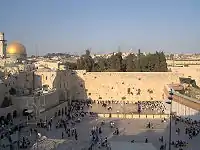 - دیوار نُدبه (در عبری: הכותל המערבי، تلفظ: کوتِل همعرابی (به معنای دیوار غربی)،[33] تلفظ عامیانه عبری: کُتِل) مقدسترین مکان مذهبی یهودیان است که بر روی تپه موریا در شهر اورشلیم قرار دارد. بر باور یهودیان دیوار ندبه از آخرین باقیماندههای هیکل سلیمان و دومین پرستشگاه اورشلیم و مرکز دعا برای یهودیان سراسر جهان است.