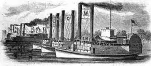 ![]() Ships in the foreground are: Monarch (letter "M" between stacks), Queen of the West (with letter "Q") and Lioness(letter "L"). In the left background are: Switzerland (with letter "S" on paddlebox), Samson and Lancaster are in the background. | |