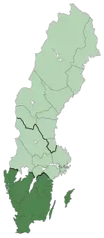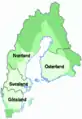 نقشهٔ سه سرزمین تاریخی سوئد، استان پیشین سوئد، اوسترلند در فنلاند، و سرزمین تاریخی پیشین دانمارک (اسکونهلاند) در سوئد جنوبی.