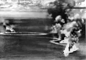 ![]() British heavy cruisers HMS Dorsetshire and Cornwall under Japanese air attack and heavily damaged on 5 April 1942 ناو سنگین بریتانیایی، اچاماس دورستشایر و اچاماس کورنوال زیر حمله و آسیب شدید از سوی نیروی هوایی ژاپن در ۵ آوریل ۱۹۴۲. | |||||||