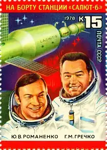 ![]() The Salyut 6 cosmonauts—Romanenko and گئورگی گرچکو—featured on a 1978 postal stamp | |