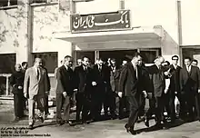 یوسف خوشکیش (نفر پنجم از راست که دستش را بالا گرفته) به همراه جمشید آموزگار در حال خروج از بانک ملی ایران