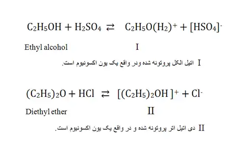 - همانند آب، بسیاری از ترکیبات آلی که دارای اکسیژن هستند میتوانند به عنوان باز عمل کنند و پروتون دریافت کنند؛ برای مثال اتیل الکل و دی اتیل اتر تشکیل دو یون اکسونیوم I و II را میدهند.